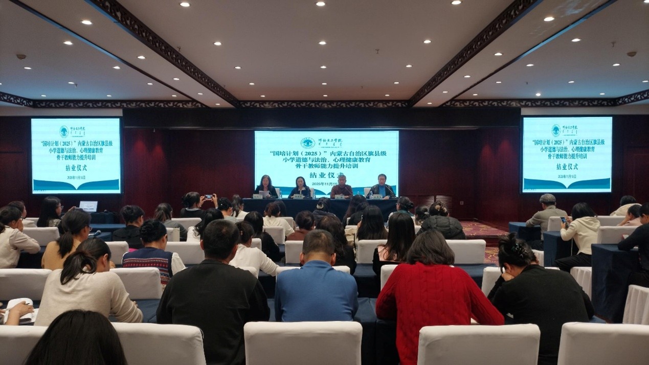2025 年 11 月 15 日上午,“国培计划(2025)” 内蒙古自治区旗县级小学道德与法治、心理健康教育骨干教师培训班结业仪式顺利举行。304永利集团经理莎茹莉、海拉尔区教育研修中心副主任毕秀芝、道德与法治教研员王静飞等领导及专家出席,全体参训教师参会。仪式由304永利集团副经理汪鑫主持。
